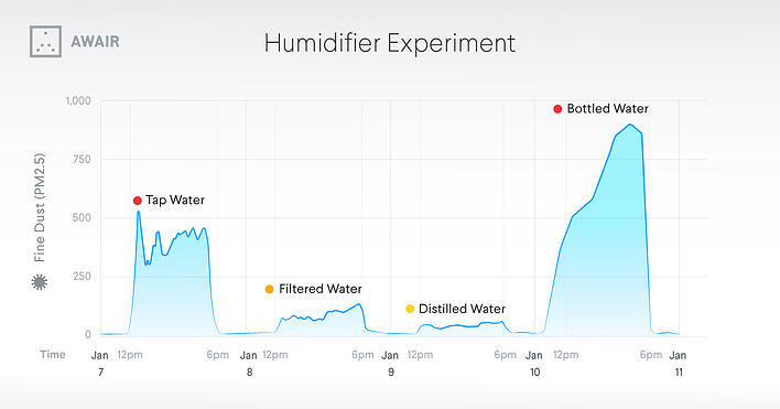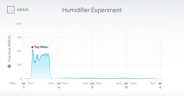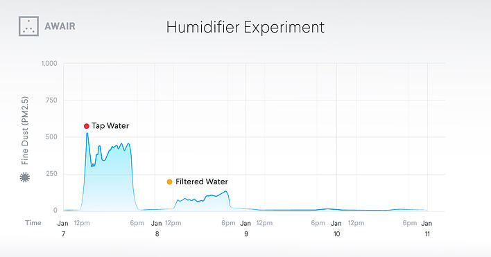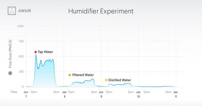 In order to prevent the growth of bacteria and other microorganisms, tap water is typically treated with various chemicals, including fluoride and chlorine. In addition, some tap water has been found to contain traces of toxic metal salts, hormones, or other contaminants from pipes. When we fill our humidifiers with water from the sink, these unwanted tap water ingredients are also turned to water vapor, dispersing throughout our homes and effectively being identified as fine particulates by the Awair 2nd Edition.